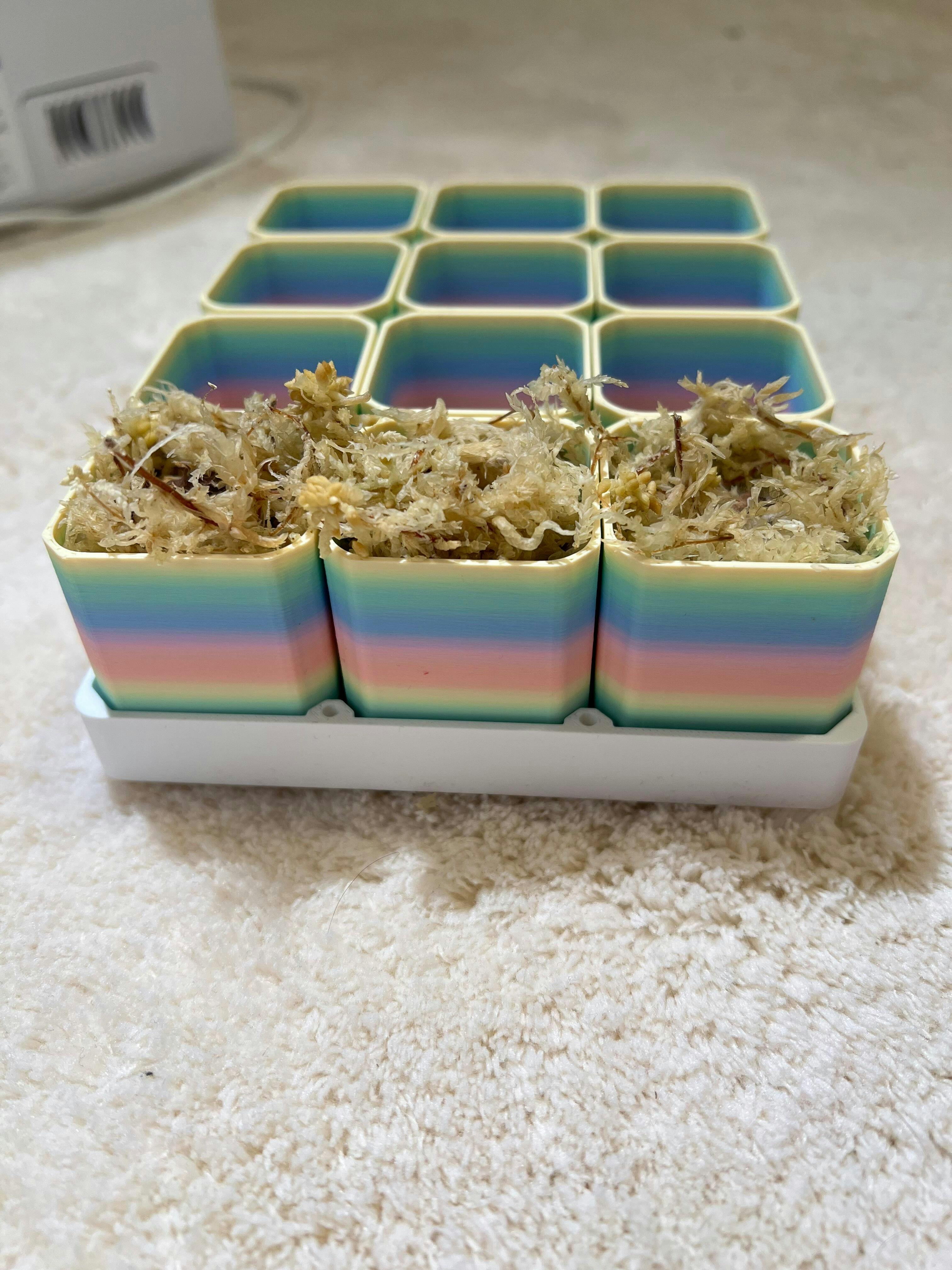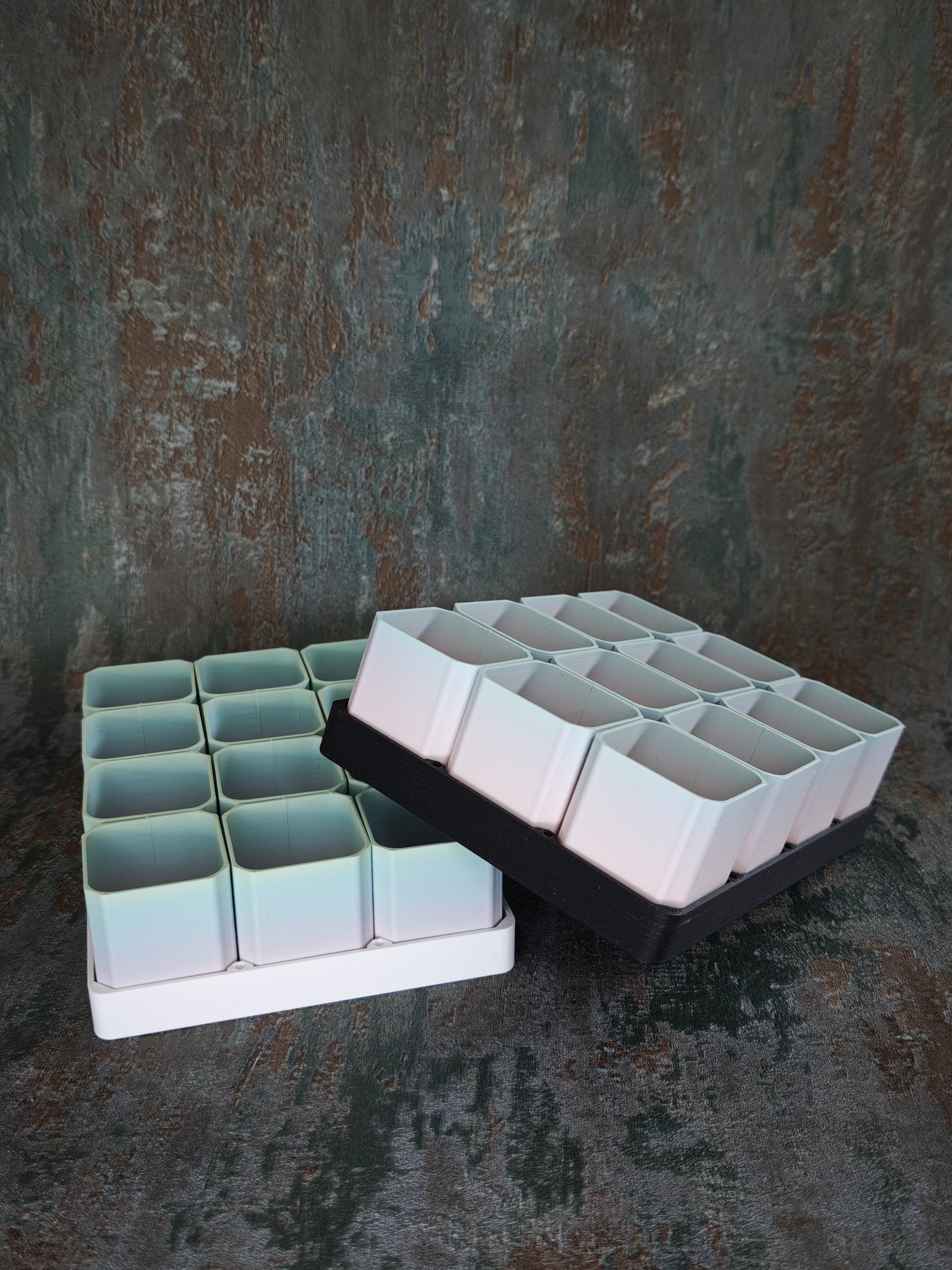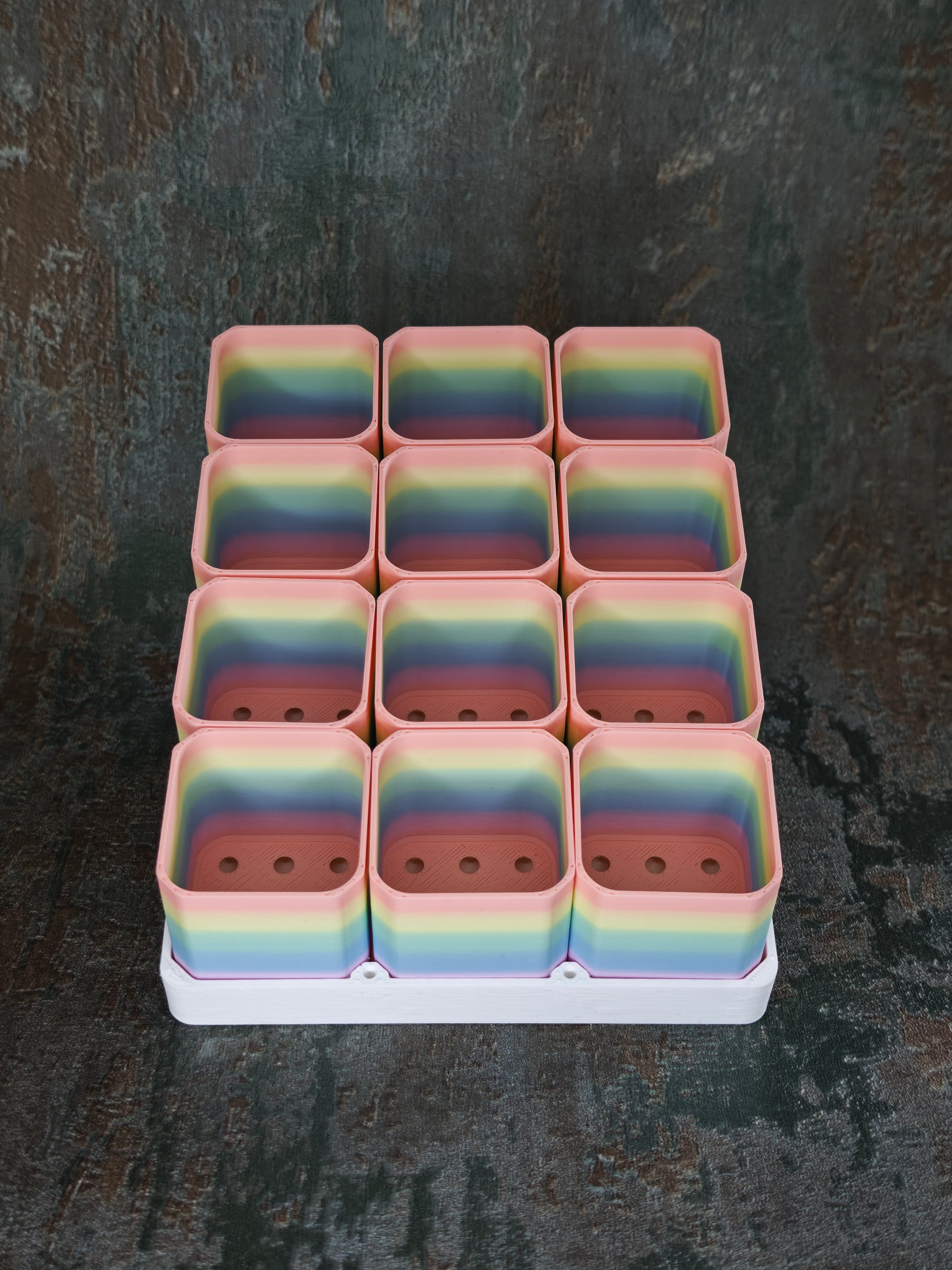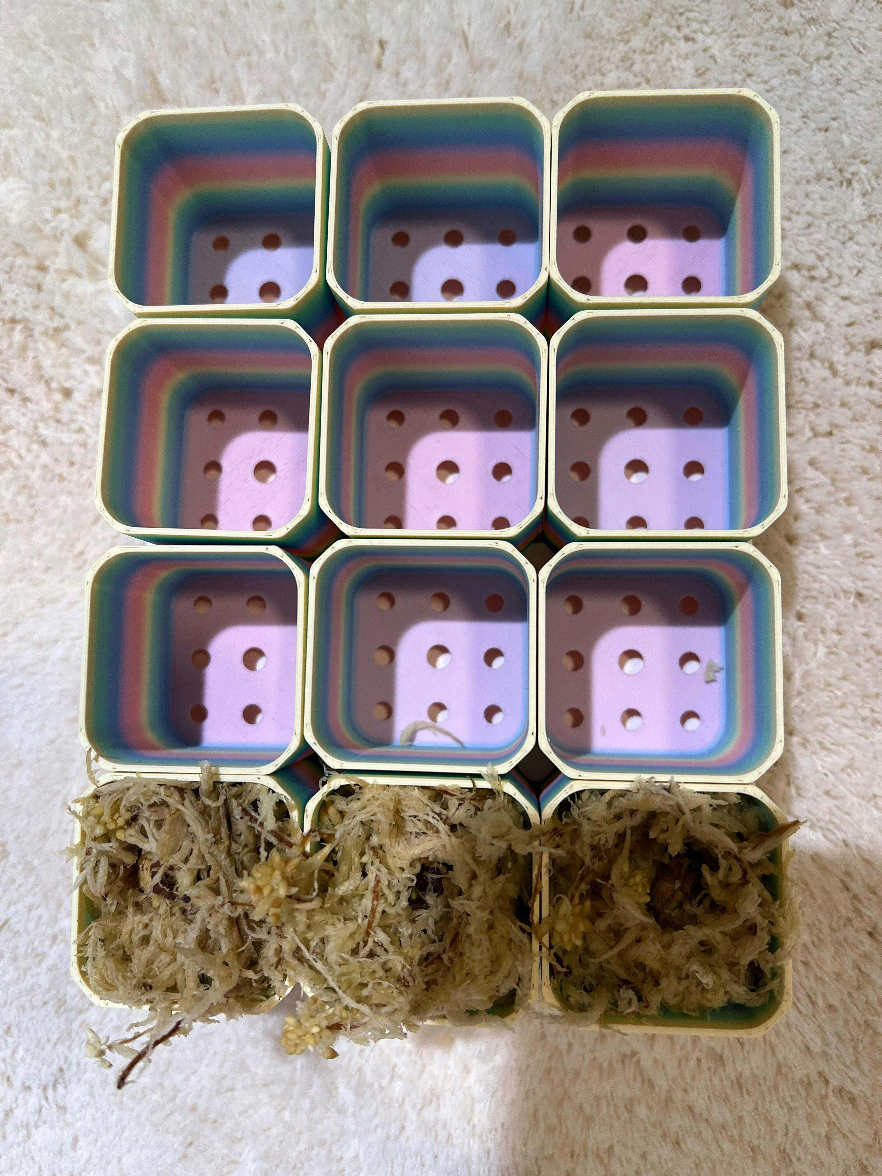 Dieses durchdachte Anzuchttray bietet idealen Platz für deine Pflanzenbabys, ob Alocasien-Rhizome, TC-Pflanzen oder andere Lieblinge, die du selbst großziehen möchtest. Die 12 kleinen Becher stehen mit etwas Abstand über dem Boden und bleiben so nach dem Gießen schön feucht aber nicht nass. Dank jeweils 9 Ablauflöchern pro Becher staut sich kein Wasser, für gesunde Wurzeln von Anfang an. Praktisch, sauber und mit Liebe zum Detail gestaltet: der perfekte Begleiter für deine Pflanzenaufzucht.