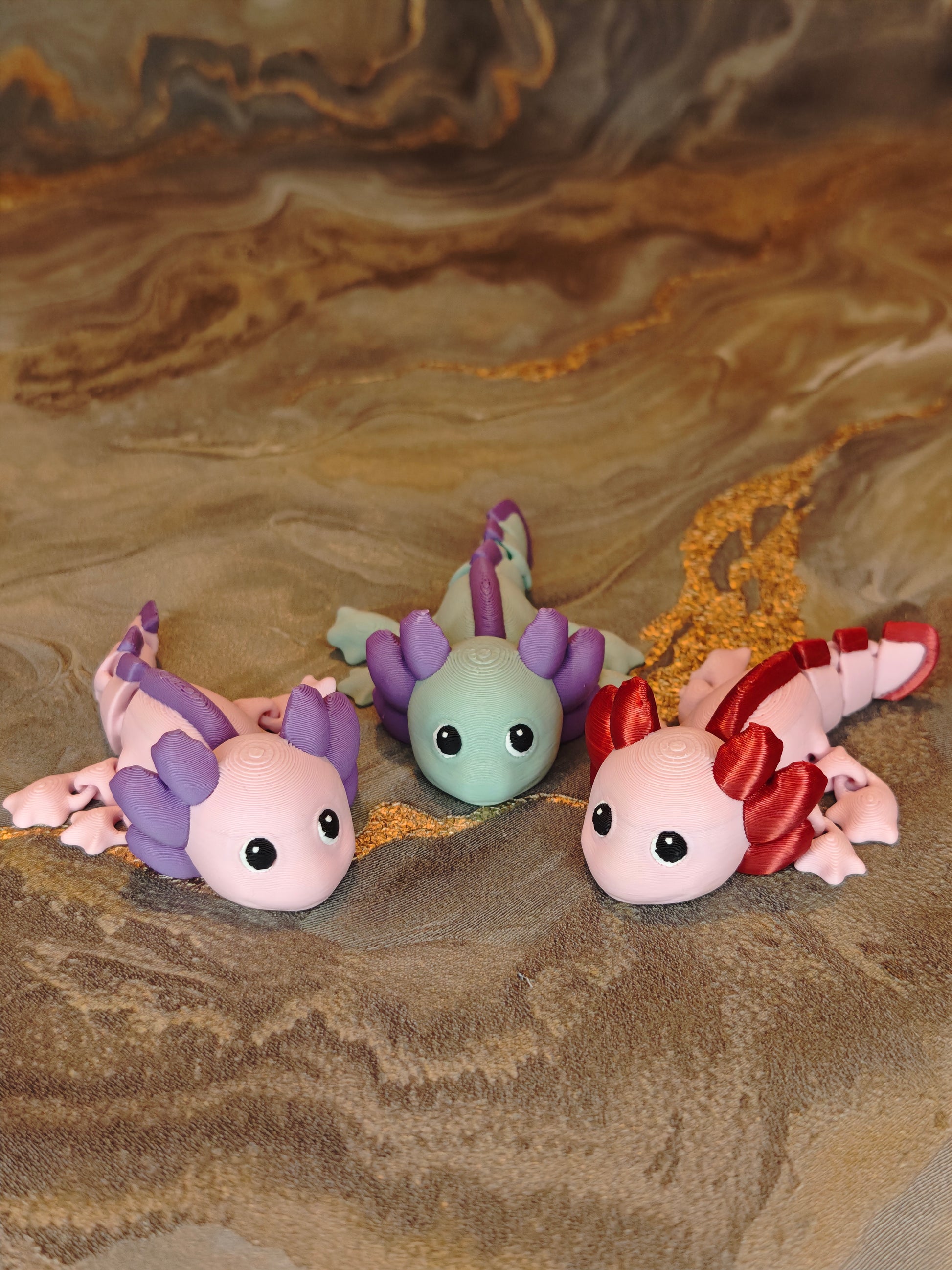 Mit ihren großen Glubschaugen, den verspielten Kiemenbüscheln und ihrem sanften Lächeln schwimmen die kleinen Axolotl direkt in dein Herz. Flexibel beweglich und liebevoll gestaltet, bringen sie den Zauber der Unterwasserwelt zu dir nach Hause. Ob als Schreibtisch-Begleiter, kleines Glückstierchen oder niedliches Geschenk, diese Axolotl sorgen garantiert für gute Laune.