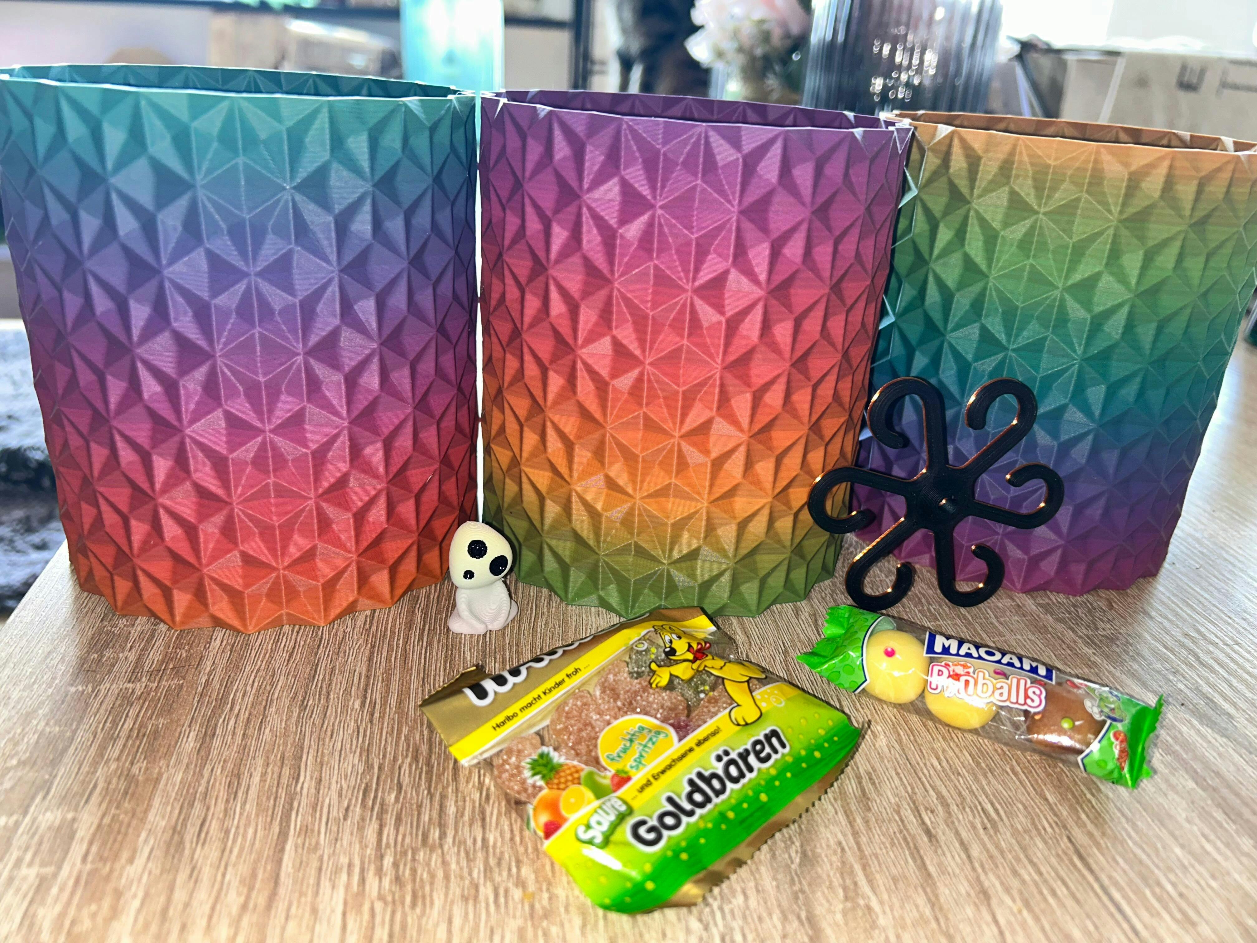 Das Design, also Form und Muster, ist bewusst gewählt, aber der Farbverlauf entsteht beim Druck ganz spontan. Jeder Topf überrascht mit einer einzigartigen Farbkomposition, die so garantiert kein zweites Mal existiert.